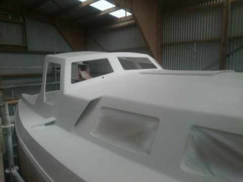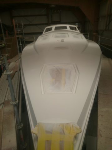 C’est la première couche, ensuite il faut poncer, mettre une deuxième couche, poncer et enfin mettre la dernière couche. On se garde l’antidérapant pour nous, plus tard, quand on aura placé tout l’accastillage sur le pont.